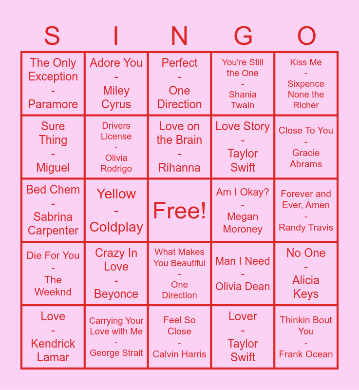 This bingo card has a free space and 38 words: Invisible String - Taylor Swift, Can't Take My Eyes Off You - Frankie Valli, Linger - The Cranberries, Drivers License - Olivia Rodrigo, No One - Alicia Keys, Crazy In Love - Beyonce, Love on the Brain - Rihanna, Just the Way You Are - Bruno Mars, Kiss Me - Sixpence None the Richer, Love Story - Taylor Swift, Yellow - Coldplay, You're Still the One - Shania Twain, Thinkin Bout You - Frank Ocean, Forever and Ever, Amen - Randy Travis, Sure Thing - Miguel, Die For You - The Weeknd, Snooze - SZA, Perfect - One Direction, Nonsense - Sabrina Carpenter, Am I Okay? - Megan Moroney, The Only Exception - Paramore, Carrying Your Love with Me - George Strait, Close To You - Gracie Abrams, Love - Kendrick Lamar, Teenage Dream - Katy Perry, Feel So Close - Calvin Harris, She Will Be Loved - Maroon 5, My Girl - The Temptations, Fade into You - Mazzy Star, Baby - Justin Bieber, One Less Lonely Girl - Justin Bieber, What Makes You Beautiful - One Direction, Lover - Taylor Swift, Adore You - Miley Cyrus, BIRDS OF A FEATHER - Billie Eilish, Man I Need - Olivia Dean, Bed Chem - Sabrina Carpenter and Clumsy - Fergie.