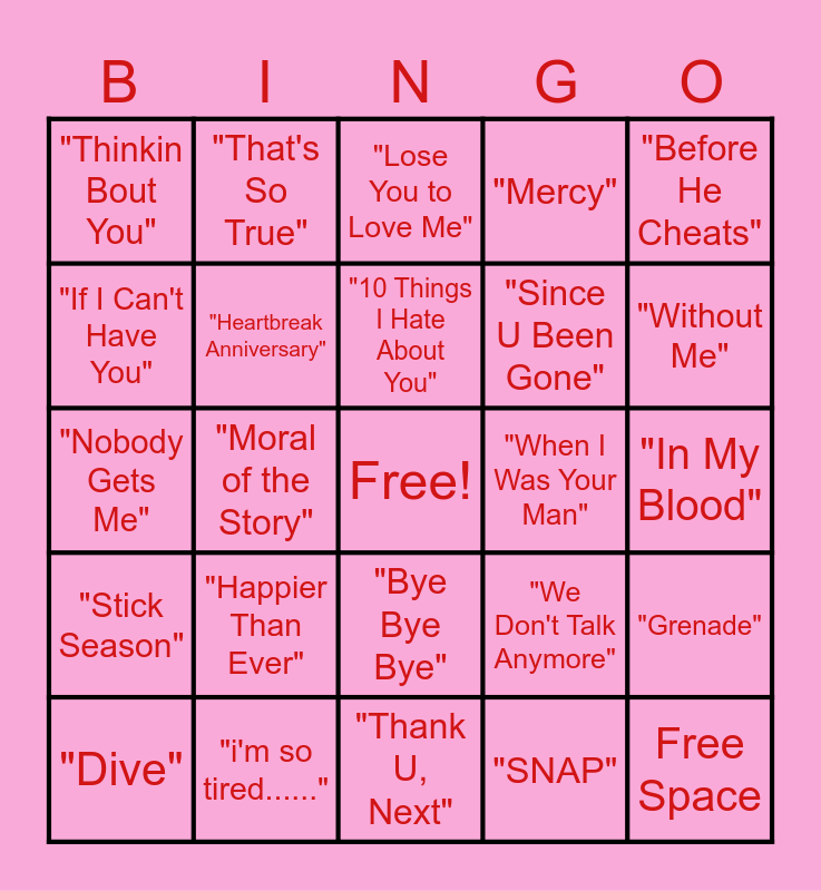 This bingo card has a free space and 41 words: "you broke me first", "Nobody Gets Me", "Drivers License", "Heartbreak Anniversary", "i'm so tired......", "Bye Bye Bye", "10 Things I Hate About You", "The One That Got Away", "Before He Cheats", "Stick Season", "Moral of the Story", "Mercy", Free Space, "In My Blood", "When I Was Your Man", "Happier Than Ever", "Hurts So Good", "Thinkin Bout You", "Talking to the Moon", "Lose You to Love Me", "Grenade", "Arcade", "Thank U, Next", "Since U Been Gone", "We Are Never Ever Getting Back Together", "One Last Time", "SNAP", "Lips Are Movin", "Without Me", "ceilings", "jealousy,jealousy", "That's So True", "Dive", "NO", "We Don't Talk Anymore", "If I Can't Have You", "Someone You Loved", "Someone Like You", "Let Her Go", "Stupid Cupid" and "deja vu".