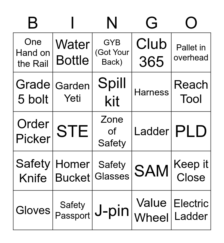 This bingo card has 25 words: Homer Bucket, J-pin, Spill kit, Gloves, Pallet in overhead, One Hand on the Rail, Grade 5 bolt, Water Bottle, Ladder, Safety Glasses, Harness, Order Picker, SAM, Keep it Close, Garden Yeti, Electric Ladder, PLD, GYB (Got Your Back), Reach Tool, STE, Zone of Safety, Safety Passport, Safety Knife, Club 365 and Value Wheel.
