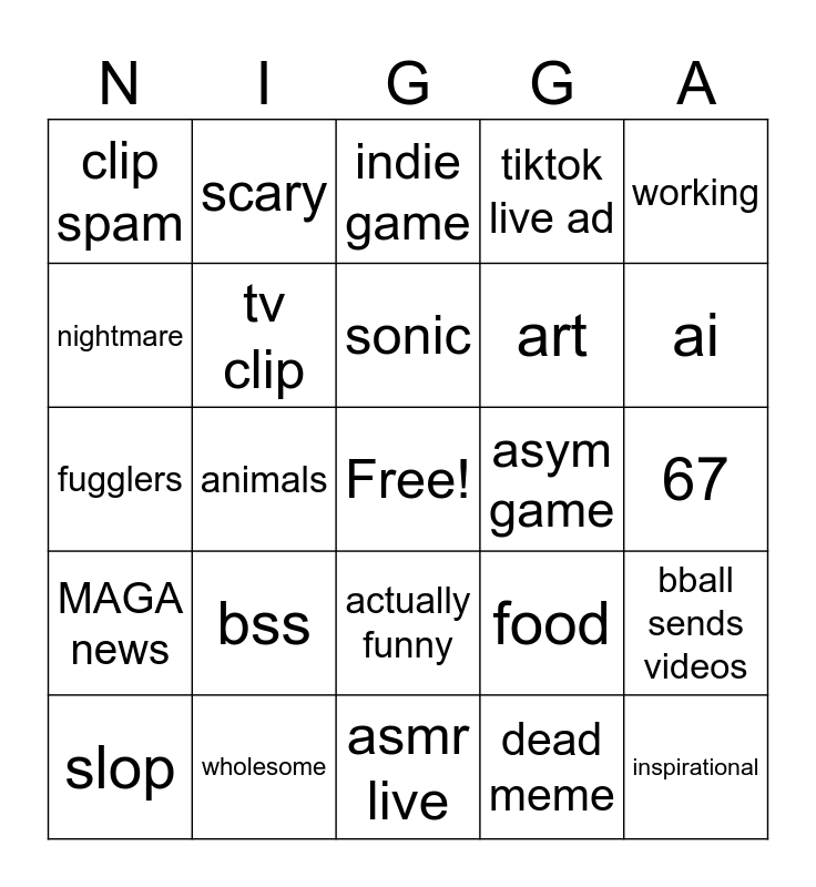 This bingo card has a free space and 24 words: bss, wholesome, sonic, slop, working, clip spam, nightmare, scary, asym game, actually funny, art, fugglers, food, bball sends videos, tv clip, dead meme, 67, indie game, ai, animals, inspirational, MAGA news, tiktok live ad and asmr live.