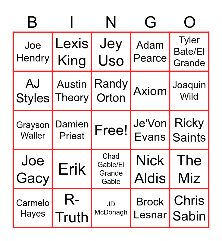 This bingo card has a free space and 84 words: Rey Mysterio, Cody Rhodes, Jey Uso, Solo Sikoa, Jacob Fatu, Gunther, Dragon Lee, Penta, Roman Reigns, Bron Breaker, Logan Paul, Bronson Reed, Austin Theory, Je'Von Evans, Oba Femi, Joe Hendry, Carmelo Hayes, AJ Styles, Aleister Black, Alex Shelley, Angelo Dawkins, Axiom, Chris Sabin, Corey Graves, Damien Priest, Seth Rollins, Finn Balor, Dexter Lumis, El Grade Americano, Erick Rowan, Erik, Ivar, Ethan Page, Grayson Waller, Ilja Dragonov, JC Mateo, JD McDonagh, Jimmy Uso, Joaquin Wild, Joe Gacy, Johnny Gargano, Julius Creed, Kevin Owens, Kit Wilson, Kofi Kingston, LA Knight, Lexis King, Ludwig Kaiser/El Grande Kaiser, Matt Cardona, Montez Ford, Nathan Frazer, Nick Aldis, Adam Pearce, Omos, Otis, Pete Dunne/El Grande, R-Truth, Randy Orton, Rey Fenix, Ricky Saints, Rusev, Sami Zayne, Shawn Spears, Sheamus, Shinsuke Nakamura, Talla Tonga, Tama Tonga, Trick Williams, Tyler Bate/El Grande, Tonga Loa, The Miz, Uncle Howdy, Xavier Woods, Dirty Dom, Chad Gable/El Grande Gable, Brock Lesnar, Chris Jericho, Stone Cold, Undertaker, Mr. Iguana, Dolph Ziggler, Buddy Murphy, Jeff Hardy and Matt Hardy.