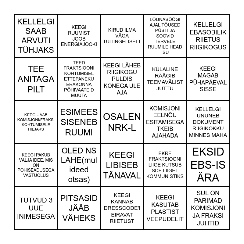 This bingo card has a free space and 27 words: EKRE FRAKTSIOONI LIIGE KUTSUB SDE LIIGET KOMMUNISTIKS, LÕUNAPAUSI AEG TEHAKSE LÜHEMAKS/PIKEMAKS, KÜLALINE RÄÄGIB TEEMAVÄLIST JUTTU, KEEGI KANNAB DRESSCODE'I EIRAVAT RIIETUST, TEE ANITAGA PILT, KIRUD ILMA VÄGA TULIINGELISELT, KEEGI RUUMIST JOOB ENERGIAJOOKI, KEEGI PAKUB VÄLJA IDEE, MIS ON PÕHISEADUSEGA VASTUOLUS, KOMISJONI EELNÕU ESITAMISEGA TKEIB AJAHÄDA, EKSID EBS-IS ÄRA, KEEGI JÄÄB KOMISJONI/FRAKSI KOHTUMISELE HILJAKS, LÕUNASÖÖGI AJAL TÕUSED PÜSTI JA SOOVID TERVELE RUUMILE HEAD ISU, TUTVUD 3 UUE INIMESEGA, PITSASID JÄÄB VÄHEKS, KEEGI MAGAB PÜHAPÄEVAL SISSE, KEEGI KANNAB VÄLISJALANÕUSID, TEED FRAKTSIOONI KOHTUMISEL ETTEPANEKU ERAKONNA PÕHIVAATEID MUUTA, KEEGI LÄHEB RIIGIKOGU PULDIS KÕNEGA ÜLE AJA, OLED NS LAHE(mul ideed otsas), KELLELGI SAAB ARVUTI TÜHJAKS, KELLELGI UNUNEB DOKUMENT RIIGIKOKKU MINNES MAHA, KEEGI KASUTAB PLASTIST VEEPUDELIT, ESIMEES SISENEB RUUMI, SUL ON PARIMAD KOMISJONI JA FRAKSI JUHTID, KEEGI LIBISEB TÄNAVAL, KELLELGI EBASOBILIK RIIETUS RIIGIKOGUS and EELNÕU EI LÄHE LÄBI.