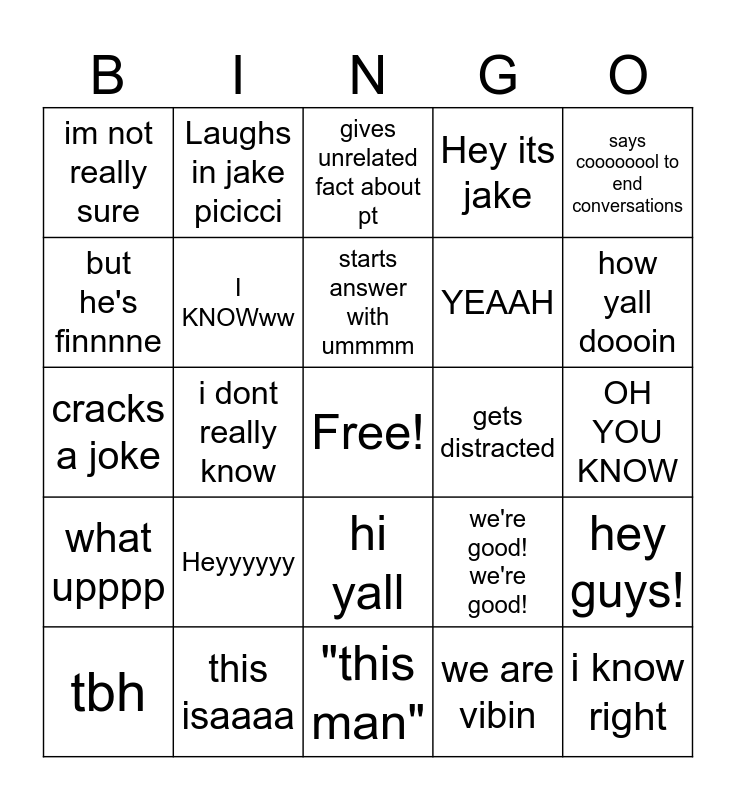 This bingo card has a free space and 24 words: Heyyyyyy, this isaaaa, starts answer with ummmm, tbh, says coooooool to end conversations, im not really sure, but he's finnnne, Laughs in jake picicci, gets distracted, hi yall, YEAAH, cracks a joke, we're good! we're good!, hey guys!, I KNOWww, we are vibin, OH YOU KNOW, gives unrelated fact about pt, how yall doooin, i dont really know, i know right, what upppp, Hey its jake and "this man".