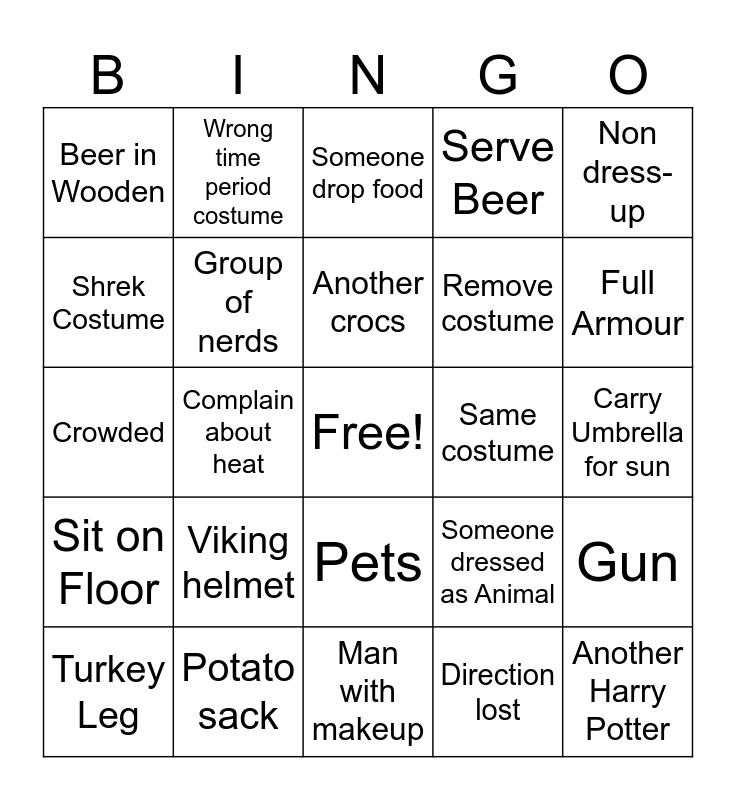 This bingo card has a free space and 24 words: Viking helmet, Potato sack, Another crocs, Turkey Leg, Non dress-up, Beer in Wooden, Shrek Costume, Wrong time period costume, Same costume, Pets, Remove costume, Crowded, Someone dressed as Animal, Gun, Group of nerds, Direction lost, Carry Umbrella for sun, Someone drop food, Full Armour, Complain about heat, Another Harry Potter, Sit on Floor, Serve Beer and Man with makeup.