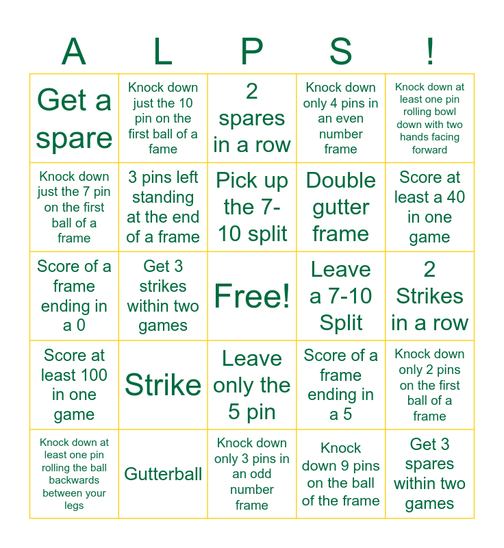 This bingo card has a free space and 24 words: Strike, Gutterball, Pick up the 7-10 split, Knock down at least one pin rolling the ball backwards between your legs, Knock down at least one pin rolling bowl down with two hands facing forward, Get a spare, Knock down just the 7 pin on the first ball of a frame, Knock down just the 10 pin on the first ball of a fame, Leave a 7-10 Split, Leave only the 5 pin, Double gutter frame, Score of a frame ending in a 0, Score of a frame ending in a 5, Knock down only 2 pins on the first ball of a frame, 3 pins left standing at the end of a frame, Knock down 9 pins on the ball of the frame, 2 Strikes in a row, 2 spares in a row, Score at least a 40 in one game, Get 3 strikes within two games, Get 3 spares within two games, Score at least 100 in one game, Knock down only 4 pins in an even number frame and Knock down only 3 pins in an odd number frame.