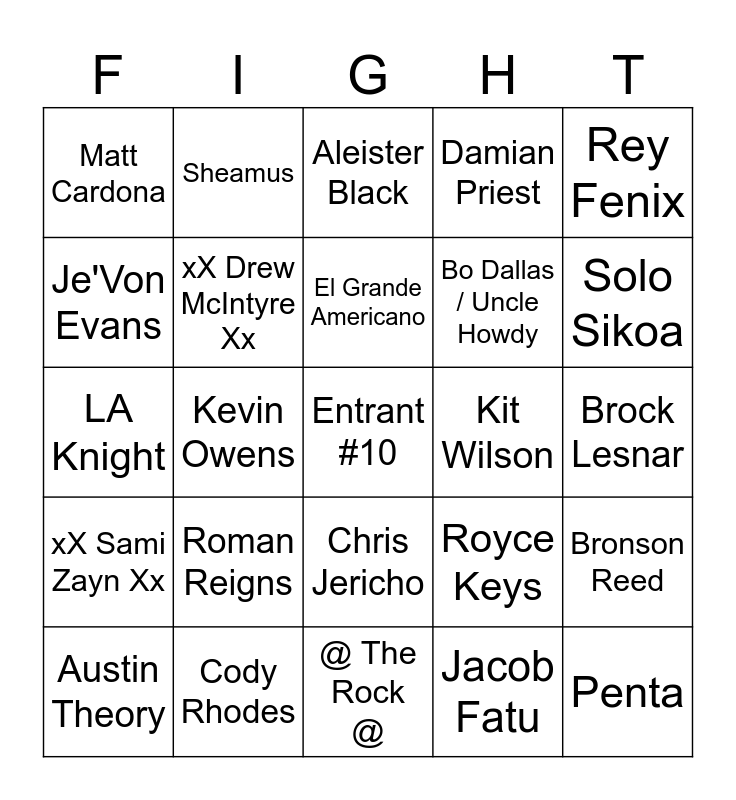 This bingo card has a free space and 61 words: xX AJ Styles Xx, Cody Rhodes, Randy Orton, xX Sami Zayn Xx, Jacob Fatu, Bron Breakker, xX Drew McIntyre Xx, xX Gunther Xx, Bo Dallas / Uncle Howdy, Carmelo Hayes, Damian Priest, Ilja Dragunov, Je'Von Evans, Jey Uso, Jimmy Uso, Matt Cardona, Penta, Rey Fenix, Shinsuke Nakamura, El Grande Americano, Kit Wilson, Aleister Black, Austin Theory, Bronson Reed, Johnny Gargano, Kofi Kingston, Logan Paul, The Miz, Solo Sikoa, Trick Williams, Xavier Woods, Akira Tozawa, Otis, R-Truth, Sheamus, Chad Gable, Dominik Mysterio, Kevin Owens, Seth Rollins, LA Knight, Oba Femi, Roman Reigns, Brock Lesnar, Omos, Royce Keys, Rusev, Ethan Page, Joe Hendry, Ricky Saints, Chris Jericho, @ The Rock @, @ Stone Cold @, Celebrity Entrant, [Betrayal!!!], [The "technically not eliminated" spot], [Heel/Face Team-up], [Team up on the big guy elimination], [ > 30 second elmination], [Eliminated wrestler helps eliminate another], TNA Entrant and AAA Entrant.