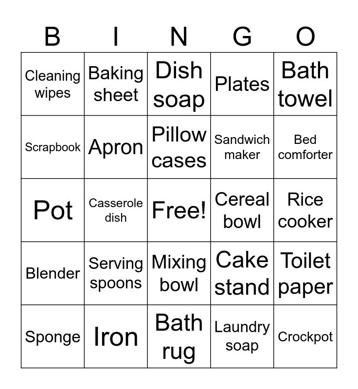 This bingo card has a free space and 44 words: Knives, Crockpot, Silverware, Sponge, Laundry basket, Laundry soap, Dish soap, Dish towel, Bath towel, Iron, Plates, Cereal bowl, Mixing bowl, Serving spoons, Tupperware, Bath rug, Pan, Pot, Air fryer, Bed comforter, Baking sheet, Mop, Cleaning spray, Cleaning wipes, Ice cream scooper, Rice cooker, Measuring cups, Drinking cups, Cake stand, Blender, Paper towels, Toilet paper, Toaster, Vacuum, Casserole dish, Gift card, Cutting board, Pillows, Pillow cases, Scrapbook, Sandwich maker, Tongs, Apron and Blanket.