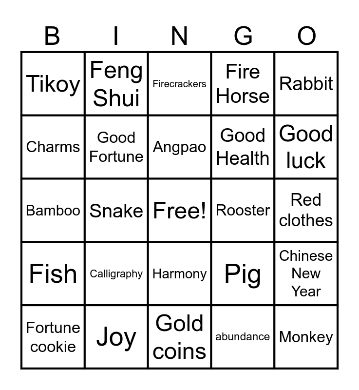 This bingo card has a free space and 57 words: Dragon, Fortune cookie, Blessings, Tikoy, Gold coins, Longevity, Good Fortune, Wealth, Good Health, Tiger, Fire Horse, Feb 17, Morality, Mahjong, Rat, Ox, Rabbit, Snake, Goat, Monkey, Rooster, Dog, Pig, Firecrackers, Lantern, Angpao, Reunions, Fireworks, Good luck, Oranges, Prosperity, Kung Hei Fat Choi, Dumplings, Temple, Red clothes, Charms, Happiness, Bamboo, Gold pot, Fish, Feng Shui, Harmony, Virtue, Long Life, Jade, Pearl, Calligraphy, Joy, Double Happiness, Lucky knots, Emerald green, abundance, Tangerines, Prosperity, Lotus Flower, Chinese New Year and Machang.