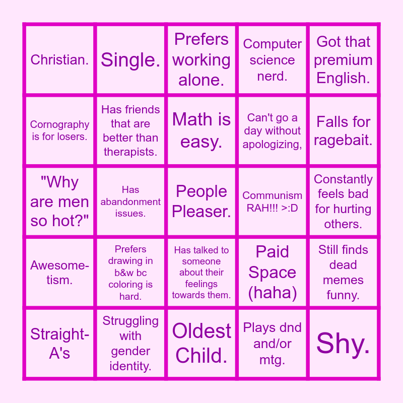 This bingo card has 25 words: Prefers drawing in b&w bc coloring is hard., Oldest Child., Math is easy., Straight-A's, Got that premium English., Christian., Cornography is for losers., Single., Communism RAH!!! >:D, Has talked to someone about their feelings towards them., Can't go a day without apologizing,, "Why are men so hot?", Paid Space (haha), Still finds dead memes funny., Has friends that are better than therapists., Shy., Constantly feels bad for hurting others., Prefers working alone., Falls for ragebait., Has abandonment issues., People Pleaser., Struggling with gender identity., Awesome-tism., Computer science nerd. and Plays dnd and/or mtg..