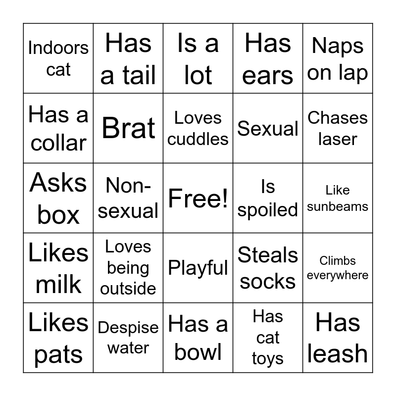 This bingo card has a free space and 24 words: Loves being outside, Despise water, Loves cuddles, Likes pats, Naps on lap, Indoors cat, Has a collar, Has a tail, Is spoiled, Playful, Sexual, Asks box, Steals socks, Climbs everywhere, Brat, Has cat toys, Like sunbeams, Is a lot, Chases laser, Non-sexual, Has leash, Likes milk, Has ears and Has a bowl.