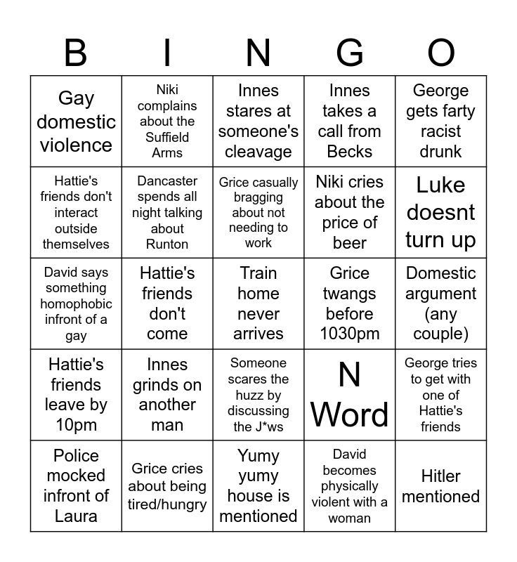 This bingo card has 25 words: Innes grinds on another man, Yumy yumy house is mentioned, Grice casually bragging about not needing to work, Police mocked infront of Laura, George gets farty racist drunk, Gay domestic violence, Hattie's friends don't interact outside themselves, Niki complains about the Suffield Arms, Grice twangs before 1030pm, Someone scares the huzz by discussing the J*ws, Niki cries about the price of beer, David says something homophobic infront of a gay, N Word, George tries to get with one of Hattie's friends, Dancaster spends all night talking about Runton, Hitler mentioned, Domestic argument (any couple), Innes stares at someone's cleavage, Luke doesnt turn up, Hattie's friends don't come, Train home never arrives, Grice cries about being tired/hungry, Hattie's friends leave by 10pm, Innes takes a call from Becks and David becomes physically violent with a woman.