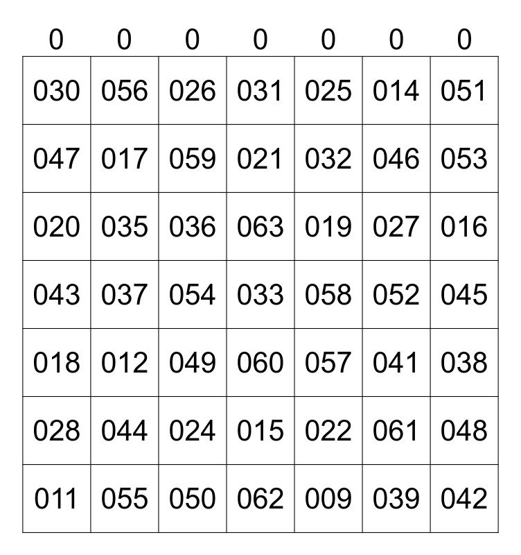 This bingo card has a free space and 55 words: 009, 016, 023, 030, 037, 044, 051, 010, 017, 024, 031, 038, 045, 052, 011, 018, 025, 032, 039, 046, 053, 012, 019, 026, 040, 047, 054, 013, 020, 027, 034, 041, 048, 055, 014, 021, 028, 035, 042, 049, 056, 015, 022, 029, 036, 043, 050, 057, 058, 059, 060, 061, 062, 063 and 064.