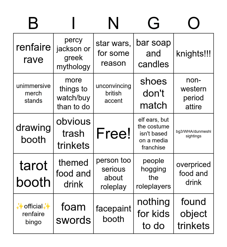 This bingo card has a free space and 24 words: themed food and drink, foam swords, unconvincing british accent, ✨official✨ renfaire bingo, knights!!!, renfaire rave, unimmersive merch stands, percy jackson or greek mythology, elf ears, but the costume isn't based on a media franchise, person too serious about roleplay, shoes don't match, drawing booth, people hogging the roleplayers, overpriced food and drink, more things to watch/buy than to do, nothing for kids to do, bg3/WHA/dunmeshi sightings, star wars, for some reason, non-western period attire, obvious trash trinkets, found object trinkets, tarot booth, bar soap and candles and facepaint booth.
