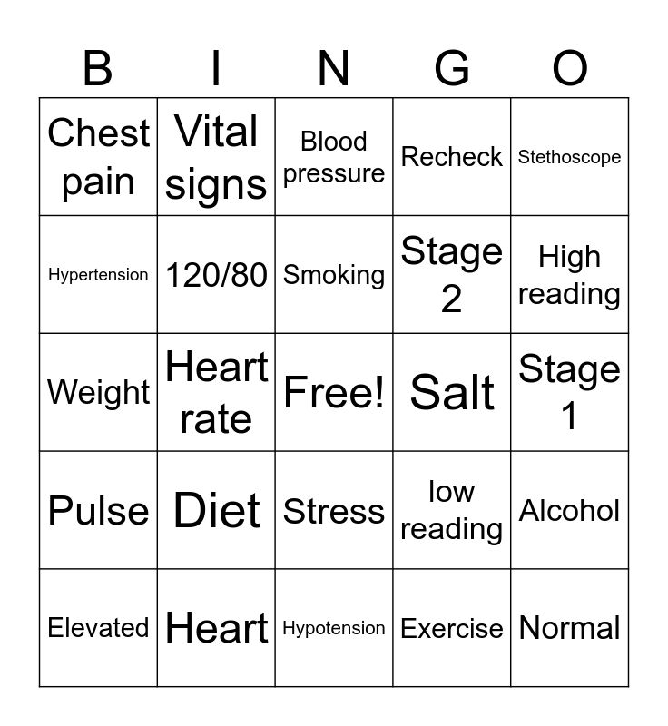 This bingo card has a free space and 24 words: Diet, Heart, Smoking, Elevated, Stethoscope, Chest pain, Hypertension, Vital signs, Salt, Stress, Stage 2, Weight, low reading, Alcohol, 120/80, Exercise, Stage 1, Blood pressure, High reading, Heart rate, Normal, Pulse, Recheck and Hypotension.
