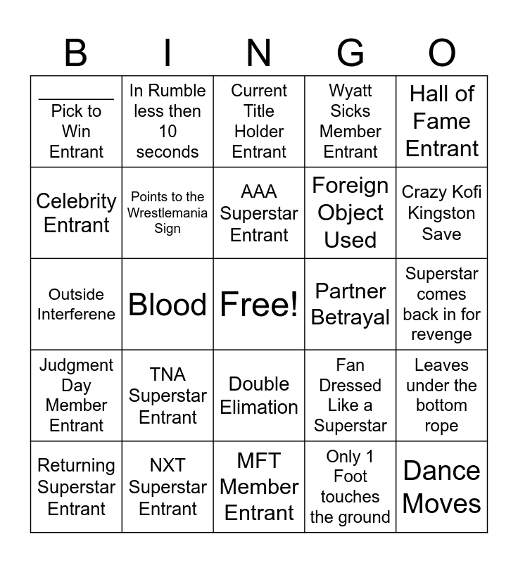 This bingo card has a free space and 24 words: TNA Superstar Entrant, NXT Superstar Entrant, AAA Superstar Entrant, Returning Superstar Entrant, Hall of Fame Entrant, ________ Pick to Win Entrant, Celebrity Entrant, In Rumble less then 10 seconds, Partner Betrayal, Double Elimation, Foreign Object Used, Outside Interferene, Fan Dressed Like a Superstar, Leaves under the bottom rope, Points to the Wrestlemania Sign, Only 1 Foot touches the ground, Superstar comes back in for revenge, Current Title Holder Entrant, Crazy Kofi Kingston Save, Blood, Dance Moves, Judgment Day Member Entrant, Wyatt Sicks Member Entrant and MFT Member Entrant.