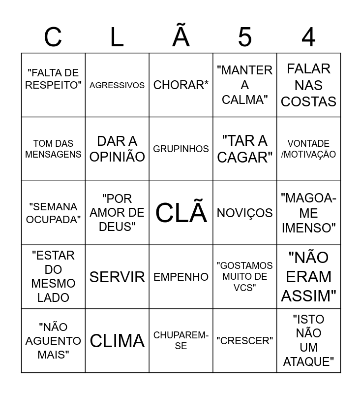 This bingo card has a free space and 24 words: SERVIR, CLIMA, GRUPINHOS, "NÃO AGUENTO MAIS", FALAR NAS COSTAS, "FALTA DE RESPEITO", TOM DAS MENSAGENS, AGRESSIVOS, NOVIÇOS, EMPENHO, "TAR A CAGAR", "SEMANA OCUPADA", "GOSTAMOS MUITO DE VCS", "NÃO ERAM ASSIM", DAR A OPINIÃO, "CRESCER", "MAGOA-ME IMENSO", CHORAR*, VONTADE /MOTIVAÇÃO, "POR AMOR DE DEUS", "ISTO NÃO UM ATAQUE", "ESTAR DO MESMO LADO, "MANTER A CALMA" and CHUPAREM-SE.