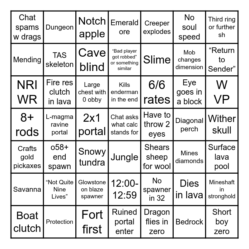 This bingo card has 205 words: Free!, Chat asks if calc is allowed, Chat asks what calc stands for, Ludwig mention, Midoffs mention, Village, Temple, Pillager outpost, Mineshaft, Dungeon, Shipwreck, Mapless bt, Ruined portal enter, Looting sword, Mineshaft in stronghold, Fastion, No spawner in 32, Treasured, Rp in Nether, Netherite ingot, Obby in blacksmith, Golem drops 3 iron, Basalt deltas, 5rd ssv fort, 8+ rods, Third ring or further sh, Mineshaft in stronghold, Pearl in stronghold chest, Wither skull, Wither effect, Hunger reset in Nether, Cooks hoglins for food, Poison stew, Mushroom stew, Saturation stew, Iron doors, Iron pressure plate, TNT spawner, Blaze spawner blows up, Lava on blaze spawner room, First place runner dies, Runner wins despite dying, Dies in lava, Dies from fall damage, Depth strider, Dolphin’s grace, No soul speed, Home portal, Bastion spawn, Fortress spawn, Creeper explodes bed, TAS skeleton, Eye goes in a block, Have to throw 2 eyes, Eye breaks, Protection, Feather falling, Mending, Silk Touch, Diamond pick, Surface lava pool, Snowy tundra, Mesa, Taiga, Mega taiga, Jungle, Dark oak, Savanna, Mushroom island, Water bucket clutch, NRI WR, Sub 12, 12:00-12:59, 13:00-13:59, 14:00-14:59, Missed second portal, Cave blind, Mines diamonds, Gold axe, First try flint, 30+ gravel needed for flint, 20+ blazes needed for 7 rods, 6/6 rates, Zombie piglin in bastion, Double bad no triple stables, Double triple stables, Double single bridge, Bed for blocks, Debris (not in chest), TNT netherrack, Short boy zero, Tall boy zero, Side setup zero, 1 in 8 zero, 2+2 zero, y100+ zero, Dragon flies in zero, Runner wins seed off one cycle, Dies during zero, Boat break, 3+ minute perch, Insta perch, <20 second nav, 2+ minute nav, Pearl in sh chest, Crafts gapples, Bottom treasure first, Boat clutch, Chat spams w drags, Chat spams l drags, Cinema spam, ome/LOL/LO spam, Fake magma ravine, Sub 4 structureless enter, 5+ minute enter, Toolsmith, 15+ obby in chest, Large chest with 0 obby, <500 block blind, 2000+ block blind, Shears sheep for wool, Library for string, Crafts diamond sword, 1k+ blocks out in nether, 3rd ring or further sh, Crafts garrots, Hoe, Endermite, Leaves bastion w/ <3 fire res, Leaves bastion w/ <16 pearls, Bastion and fort intersect, Crafts gold armor before entering bastion, Lava housing, o58+ end spawn, “Not Quite Nine Lives”, “Subspace Bubble”, “Return to Sender”, No “Free the End”, Diamond armor, Cod strats for bucket, Iron axe trade, Notch apple, Looks at enderman, Kills enderman in the end, Poundy portal, Woodlight, 3+ eye, Not enough eyes for portal, A runner dies multiple times, Weird end island, W VP, L VP, Mob nation in cave, Needs iron in bastion, “Bad player got robbed” or something similar, “Danny got robbed” or something similar, Seed 10, Warped forest fort, Kills enderman in nether, Horrible piglin trades, Fire res clutch in lava, Half a heart, Boats down after zero instead of pearl, Kills piglin, Fort first, Second portal hit but not starter, Portal room on second portal, <y20 starter, y45+ starter, Sees bedrock, Diagonal perch, Opposite direction perch on one cycle setup, Dragon flips, Explodes anchors used in zero setup, Hits zombie piglin, Misplace obby, Creeper explodes, Mob changes dimension, Magma cube in fort, Glowstone in bastion, Glowstone on blaze spawner, Tree on blaze spawner, Slime, Witch, Zombie villager, Overworld enderman, Rain, Ghost bucket, Ravine, L-magma ravine portal, Failed magma portal, 2x1 portal, Ocean exposed sh, Ocean exposed pr, Enters pr through alternate way, Mountain blind, Emerald ore, Bedrock, Monument, Mines backup blocks, Multiple bastions in 1 run, Failed boat clutch, Garrots in rp, Crafts gold pickaxes and Anchor setup in one cycle.