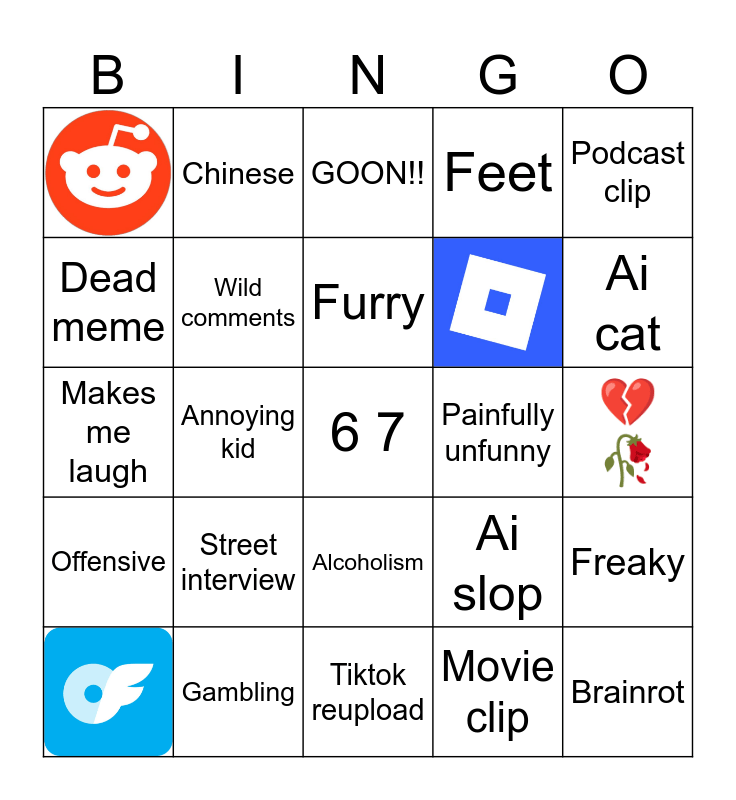 This bingo card has 4 images, a free space and 25 words: subway surfers, Annoying kid, Funny animal, GOON!!, Wild comments, Street interview, Painfully unfunny, Gambling, 💔🥀, Brainrot, Tiktok reupload, Movie clip, Ai cat, Alcoholism, Offensive, Podcast clip, Makes me laugh, Ai slop, Live stream clip, Dead meme, Feet, Chinese, Freaky, Furry and Old person on phone.
