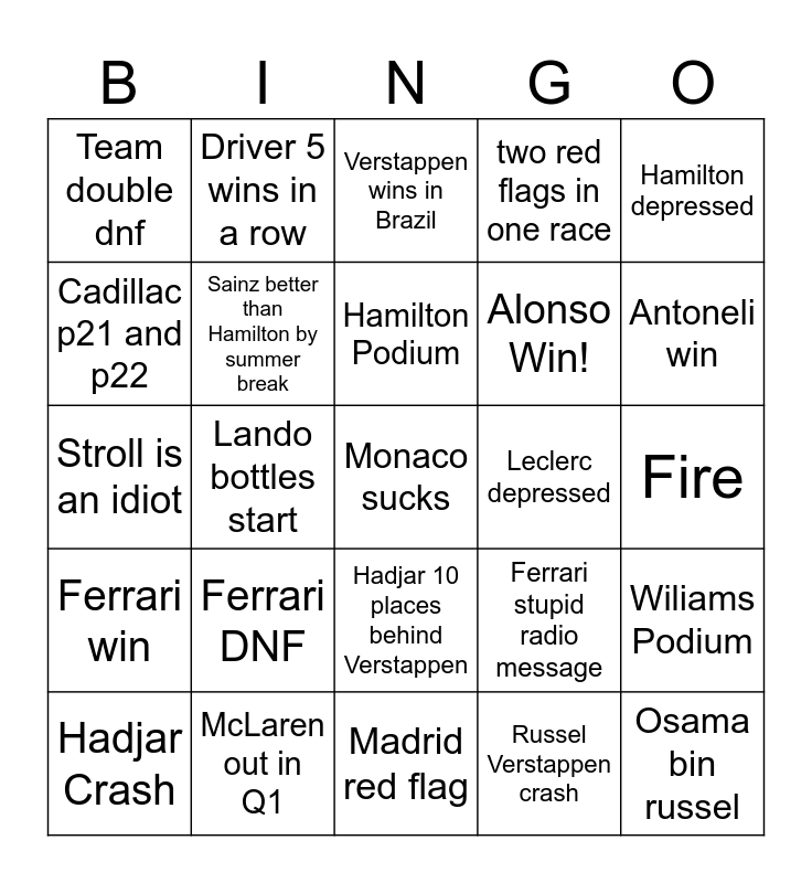 This bingo card has a free space and 24 words: Ferrari DNF, McLaren out in Q1, Hamilton Podium, Hadjar Crash, Hamilton depressed, Team double dnf, Cadillac p21 and p22, Driver 5 wins in a row, Leclerc depressed, Hadjar 10 places behind Verstappen, Alonso Win!, Stroll is an idiot, Ferrari stupid radio message, Wiliams Podium, Sainz better than Hamilton by summer break, Russel Verstappen crash, Fire, Verstappen wins in Brazil, Antoneli win, Lando bottles start, Osama bin russel, Ferrari win, two red flags in one race and Madrid red flag.