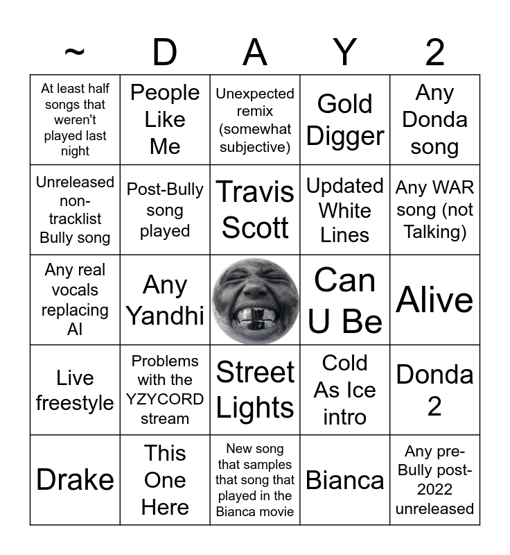 This bingo card has a free space and 24 words: Problems with the YZYCORD stream, This One Here, Travis Scott, Drake, Any Donda song, At least half songs that weren't played last night, Unreleased non-tracklist Bully song, People Like Me, Can U Be, Street Lights, Updated White Lines, Any real vocals replacing AI, Cold As Ice intro, Donda 2, Post-Bully song played, Bianca, Alive, Unexpected remix (somewhat subjective), Any WAR song (not Talking), Any Yandhi, Any pre-Bully post-2022 unreleased, Live freestyle, Gold Digger and New song that samples that song that played in the Bianca movie.