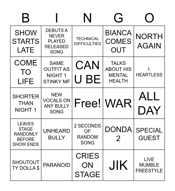 This bingo card has a free space and 24 words: UNHEARD BULLY, PARANOID, CAN U BE, SHOUTOUT TY DOLLA $, NORTH AGAIN, SHOW STARTS LATE, COME TO LIFE, DEBUTS A NEVER PLAYED RELEASED SONG, WAR, 2 SECONDS OF RANDOM SONG, TALKS ABOUT HIS MENTAL HEALTH, SHORTER THAN NIGHT 1, DONDA 2, SPECIAL GUEST, SAME OUTFIT AS NIGHT 1 STINKY MF, JIK, ALL DAY, TECHNICAL DIFFICULTIES, 1. HEARTLESS, NEW VOCALS ON ANY BULLY SONG, LIVE MUMBLE FREESTYLE, LEAVES STAGE RANDOMLY BEFORE SHOW ENDS, BIANCA COMES OUT and CRIES ON STAGE.