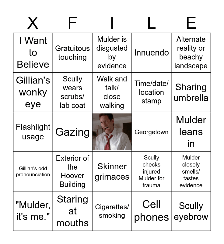 This bingo card has a free space and 24 words: Exterior of the Hoover Building, Staring at mouths, Walk and talk/ close walking, "Mulder, it's me.", Alternate reality or beachy landscape, I Want to Believe, Gillian's wonky eye, Gratuitous touching, Georgetown, Skinner grimaces, Time/date/ location stamp, Flashlight usage, Scully checks injured Mulder for trauma, Mulder closely smells/ tastes evidence, Scully wears scrubs/ lab coat, Cell phones, Mulder leans in, Mulder is disgusted by evidence, Sharing umbrella, Gazing, Scully eyebrow, Gillian's odd pronounciation, Innuendo and Cigarettes/ smoking.
