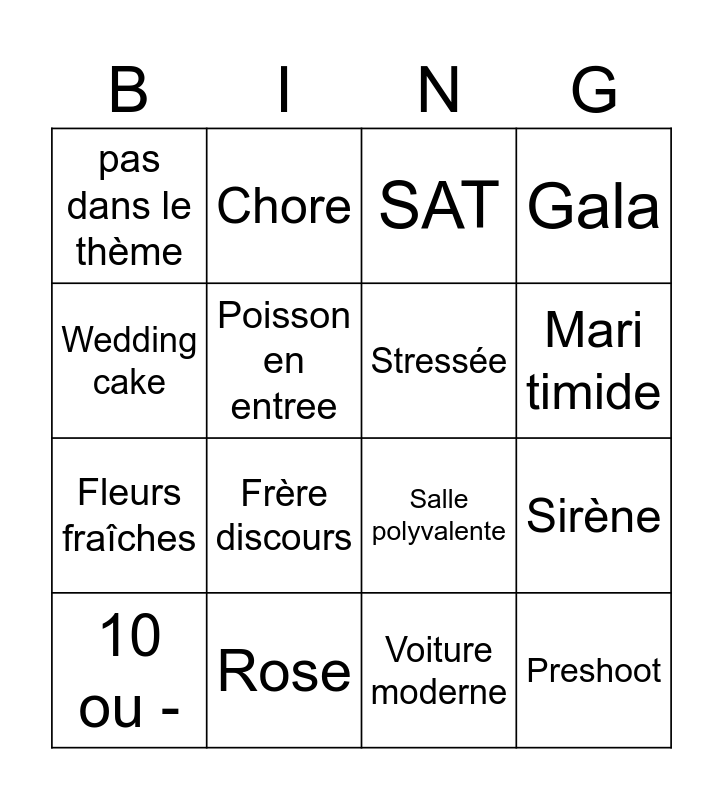 This bingo card has 16 words: Rose, Sirène, SAT, pas dans le thème, Fleurs fraîches, Chore, Salle polyvalente, Voiture moderne, Wedding cake, Poisson en entree, 10 ou -, Gala, Frère discours, Mari timide, Stressée and Preshoot.