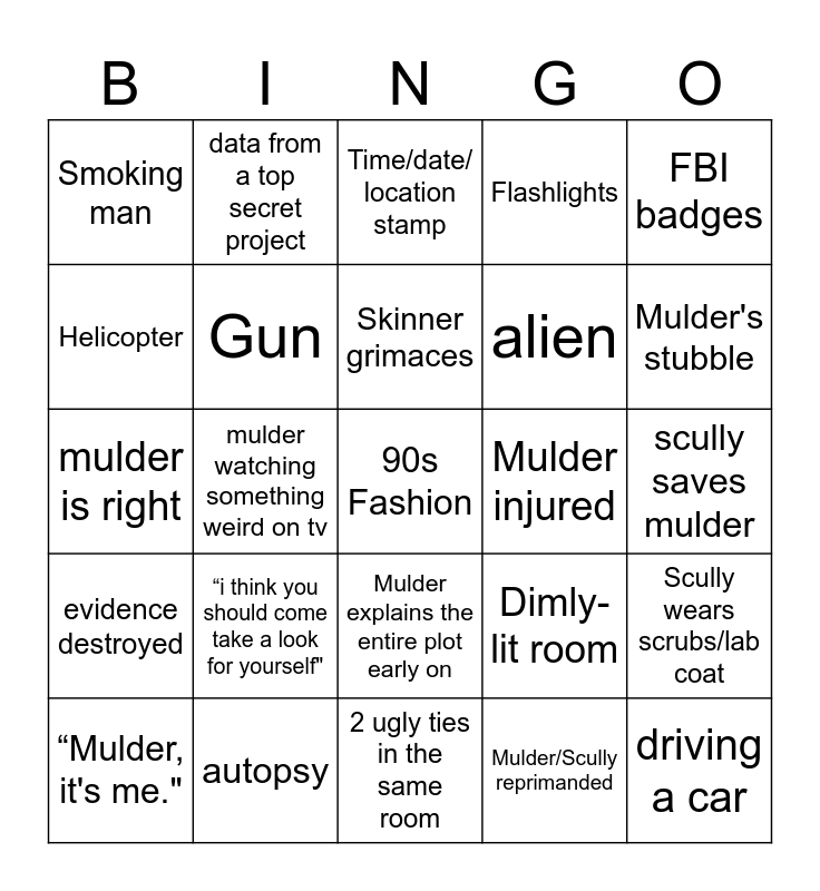 This bingo card has a free space and 59 words: mysterious note/message, autopsy, UFO, evidence destroyed, Mulder/Scully reprimanded, Monster, Gun, Mulder/Scully asked to leave, alien, character killed, Flashlights, "There's no evidence, Mulder.", Helicopter, mention of Samantha, Lone Gunmen, Smoking man, driving a car, FBI badges, Hoover Building, Skinner grimaces, Mulder injured, Time/date/ location stamp, “Mulder, it's me.", Scully wears scrubs/lab coat, I Want to Believe, Fog, Sharing umbrella, Walk and talk/close walking, Mulder's stubble, Harsh light in forest, Rolled shirt sleeves, Fox/ Dana, Poetic monologue, skinner shows compassion, data from a top secret project, search/seizure without warrant, MiB, mulder watching something weird on tv, mulder saves scully, mulder is right, mulder yells, “i think you should come take a look for yourself", scully saves mulder, field report voice over, scully misses paranormal/ supernatural experience, mulder goes off to investigate alone, mulder believes a psychic, Mulder sleeps on his couch, Mulder explains the entire plot early on, 2 ugly ties in the same room, Mulder/Scully snarky comment, Mulder/Scully snarky again, Someone says "The X-Files", Blurry Security Camera Footage, A Creature Escapes at End of Episode, Dimly-lit room, Raining, Henchmen and Scummy hotel.