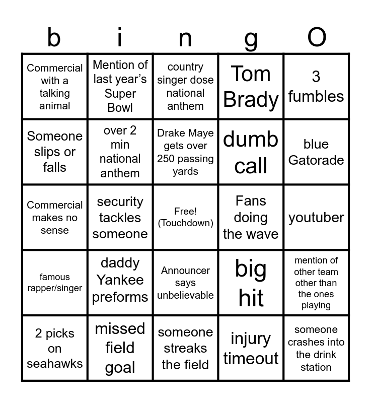 This bingo card has a free space and 24 words: daddy Yankee preforms, missed field goal, Drake Maye gets over 250 passing yards, 2 picks on seahawks, 3 fumbles, Commercial with a talking animal, Someone slips or falls, Mention of last year’s Super Bowl, Fans doing the wave, Announcer says unbelievable, dumb call, Commercial makes no sense, big hit, mention of other team other than the ones playing, over 2 min national anthem, injury timeout, youtuber, country singer dose national anthem, blue Gatorade, security tackles someone, someone crashes into the drink station, famous rapper/singer, Tom Brady and someone streaks the field.