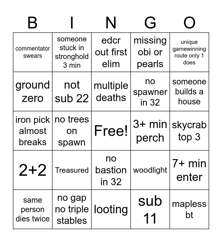 This bingo card has a free space and 24 words: Treasured, no gap no triple stables, multiple deaths, same person dies twice, unique gamewinning route only 1 does, commentator swears, ground zero, someone stuck in stronghold 3 min, 3+ min perch, no bastion in 32, no spawner in 32, iron pick almost breaks, woodlight, 7+ min enter, not sub 22, sub 11, skycrab top 3, edcr out first elim, someone builds a house, no trees on spawn, mapless bt, 2+2, missing obi or pearls and looting.
