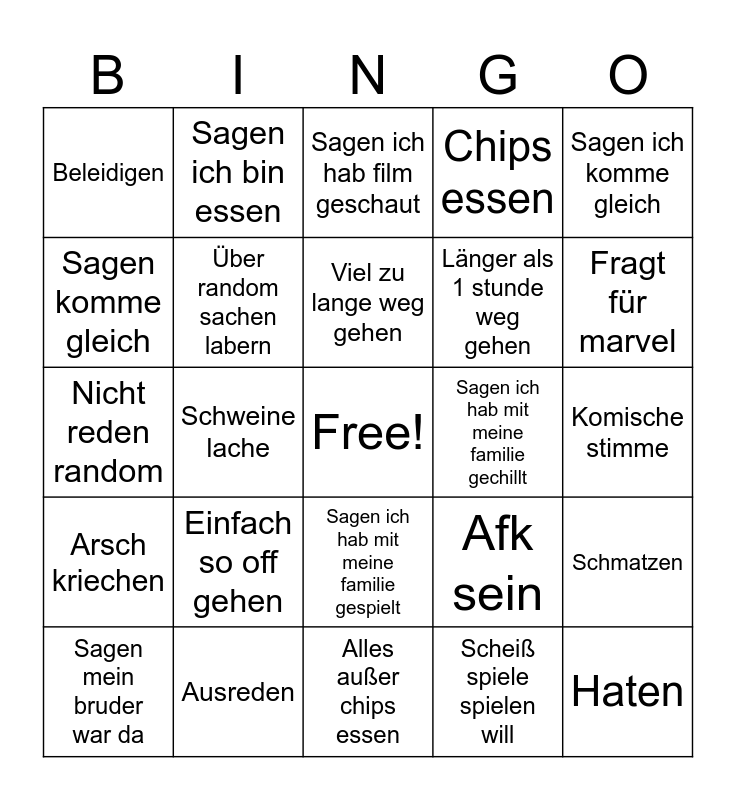 This bingo card has a free space and 24 words: Einfach so off gehen, Ausreden, Viel zu lange weg gehen, Sagen mein bruder war da, Sagen ich komme gleich, Beleidigen, Sagen komme gleich, Sagen ich bin essen, Sagen ich hab mit meine familie gechillt, Sagen ich hab mit meine familie gespielt, Länger als 1 stunde weg gehen, Nicht reden random, Afk sein, Schmatzen, Über random sachen labern, Scheiß spiele spielen will, Komische stimme, Sagen ich hab film geschaut, Fragt für marvel, Schweine lache, Haten, Arsch kriechen, Chips essen and Alles außer chips essen.