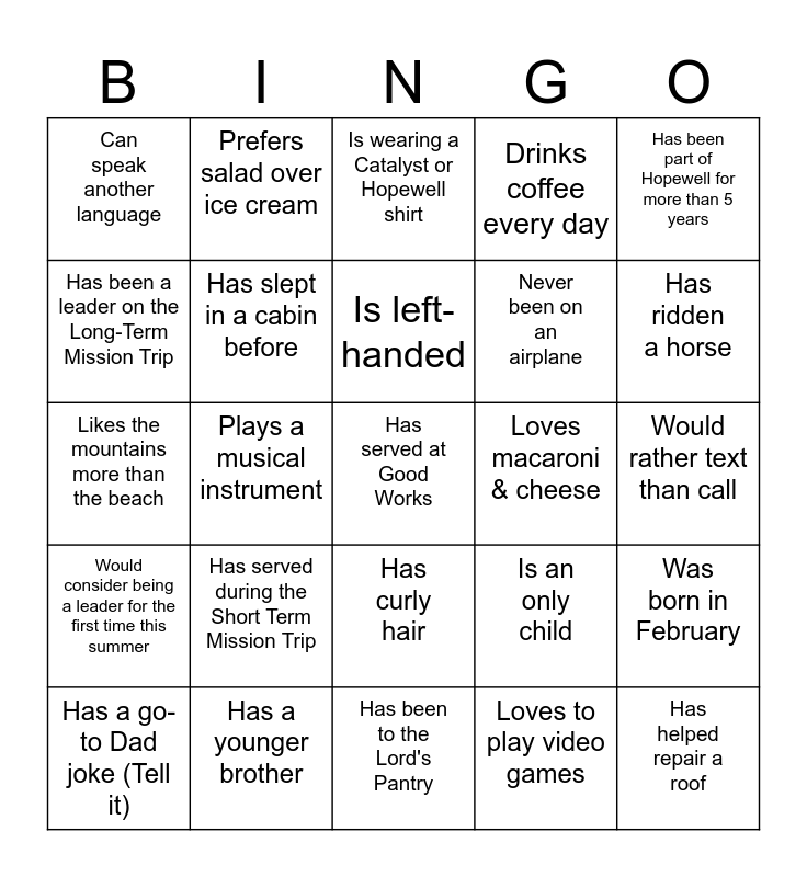 This bingo card has a free space and 24 words: Has served during the Short Term Mission Trip, Has a younger brother, Is left-handed, Has a go-to Dad joke (Tell it), Has been part of Hopewell for more than 5 years, Can speak another language, Has been a leader on the Long-Term Mission Trip, Prefers salad over ice cream, Loves macaroni & cheese, Has curly hair, Never been on an airplane, Likes the mountains more than the beach, Is an only child, Was born in February, Has slept in a cabin before, Loves to play video games, Would rather text than call, Is wearing a Catalyst or Hopewell shirt, Has ridden a horse, Plays a musical instrument, Has helped repair a roof, Would consider being a leader for the first time this summer, Drinks coffee every day and Has been to the Lord's Pantry.