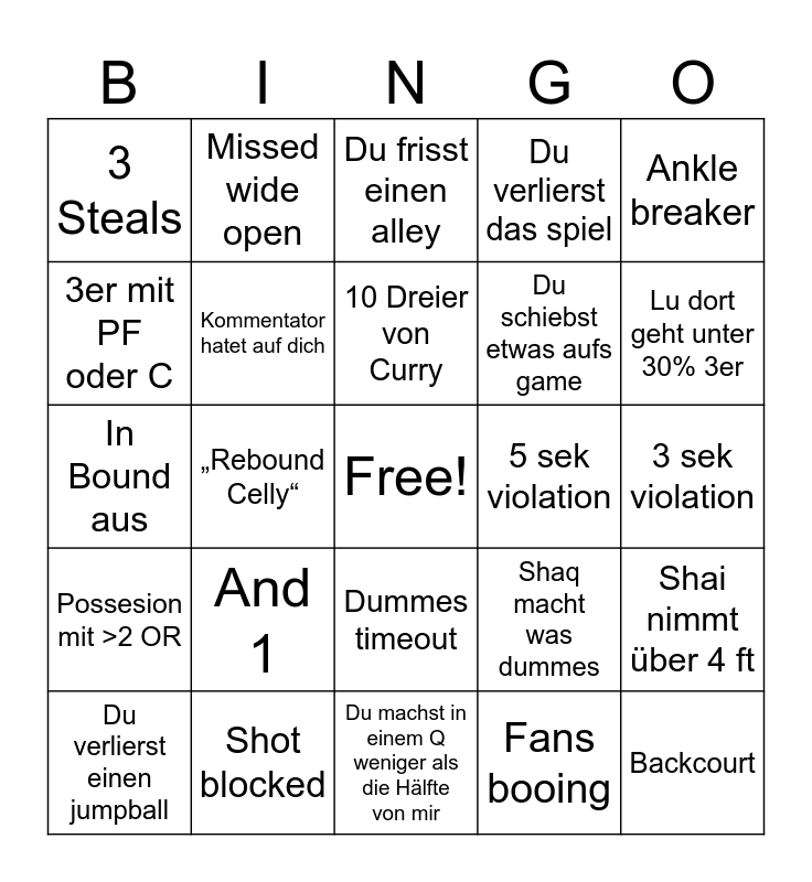 This bingo card has a free space and 24 words: And 1, Shot blocked, 10 Dreier von Curry, Du verlierst einen jumpball, Ankle breaker, 3 Steals, 3er mit PF oder C, Missed wide open, 5 sek violation, Dummes timeout, Du schiebst etwas aufs game, In Bound aus, Shaq macht was dummes, Shai nimmt über 4 ft, Kommentator hatet auf dich, Fans booing, 3 sek violation, Du frisst einen alley, Lu dort geht unter 30% 3er, „Rebound Celly“, Backcourt, Possesion mit >2 OR, Du verlierst das spiel and Du machst in einem Q weniger als die Hälfte von mir.