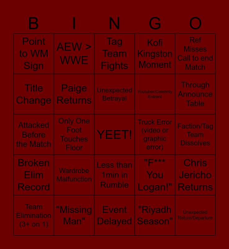 This bingo card has a free space and 24 words: Wardrobe Malfunction, "Missing Man", Unexpected Betrayal, Team Elimination (3+ on 1), Ref Misses Call to end Match, Point to WM Sign, Title Change, AEW > WWE, Truck Error (video or graphic error), Less than 1min in Rumble, Youtuber/Celebrity Entrant, Attacked Before the Match, "F*** You Logan!", Chris Jericho Returns, Paige Returns, "Riyadh Season", Faction/Tag Team Dissolves, Tag Team Fights, Through Announce Table, Only One Foot Touches Floor, Unexpected Return/Departure, Broken Elim Record, Kofi Kingston Moment and Event Delayed.