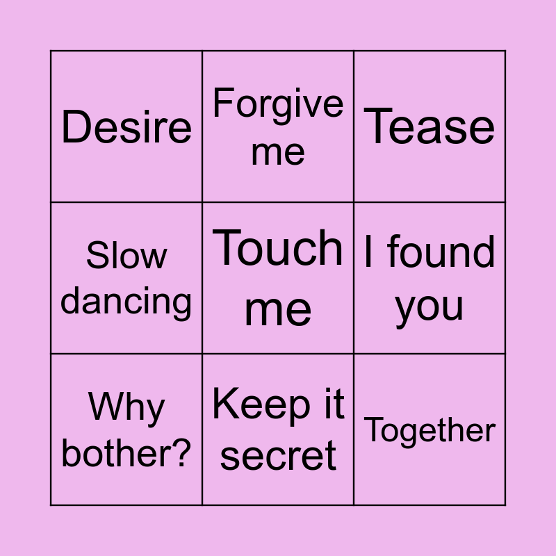 This bingo card has 18 words: Confession, Heathen, Tease, Desire, A cheek kiss, Slow dancing, I dreamt of you, Forgive me, Keep it secret, Together, We’ll be okay, Touch me, Don’t apologize, I found you, Why bother?, Breathe, Better off friends and Kisses at midnight.