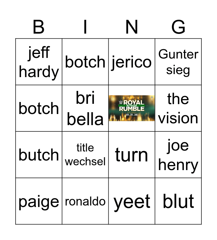 This bingo card has 1 images and 15 words: ronaldo, joe henry, jerico, jeff hardy, butch, botch, turn, yeet, botch, bri bella, paige, Gunter sieg, title wechsel, the vision and blut.