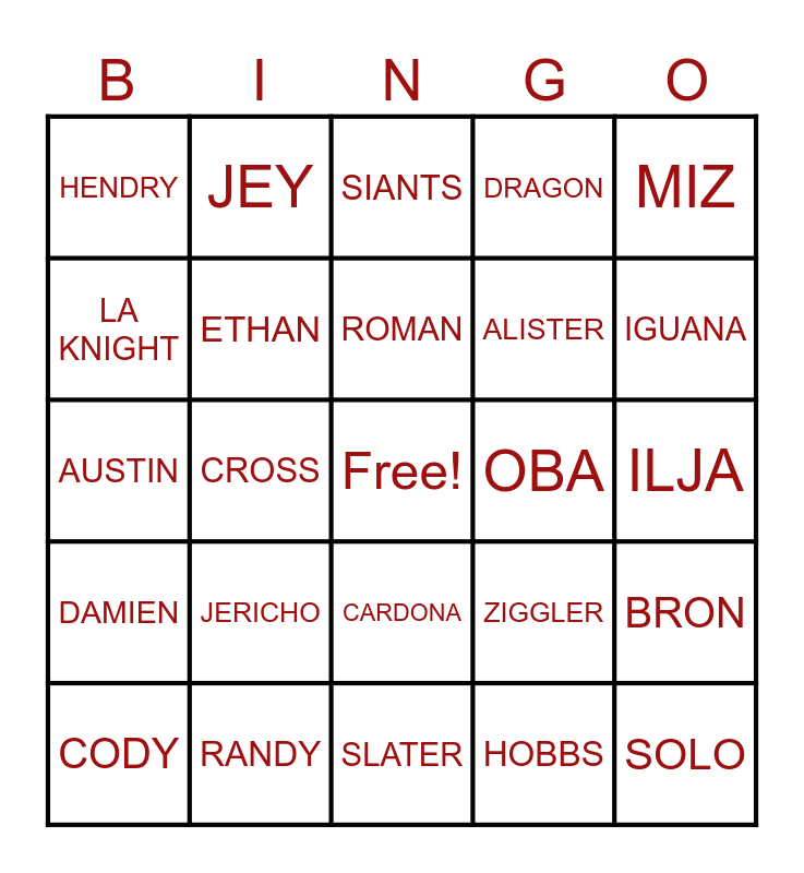 This bingo card has a free space and 24 words: CODY, JERICHO, ROMAN, HOBBS, MIZ, HENDRY, JEY, SIANTS, OBA, ILJA, AUSTIN, ETHAN, ZIGGLER, BRON, LA KNIGHT, RANDY, SLATER, DRAGON, IGUANA, DAMIEN, CROSS, CARDONA, ALISTER and SOLO.