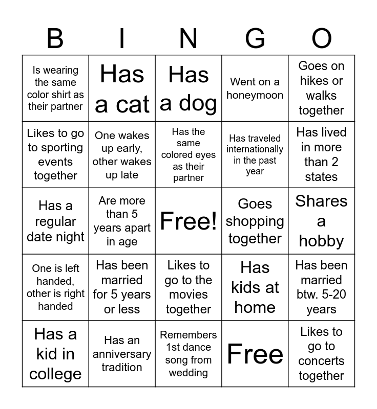This bingo card has a free space and 25 words: Has been married for 5 years or less, Remembers 1st dance song from wedding, Has the same colored eyes as their partner, Has a kid in college, Goes on hikes or walks together, Is wearing the same color shirt as their partner, Likes to go to sporting events together, Has a cat, Goes shopping together, Likes to go to the movies together, Has traveled internationally in the past year, Has a regular date night, Has kids at home, Has been married btw. 5-20 years, One wakes up early, other wakes up late, Has been married over 20 years, Shares a hobby, Has a dog, Has lived in more than 2 states, Are more than 5 years apart in age, Likes to go to concerts together, Has an anniversary tradition, One is left handed, other is right handed, Went on a honeymoon and Free.