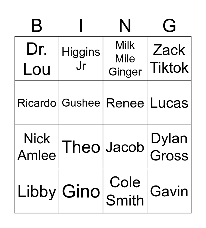 This bingo card has 16 words: Libby, Gino, Milk Mile Ginger, Zack Tiktok, Ricardo, Higgins Jr, Jacob, Dylan Gross, Dr. Lou, Gushee, Cole Smith, Lucas, Nick Amlee, Theo, Renee and Gavin.
