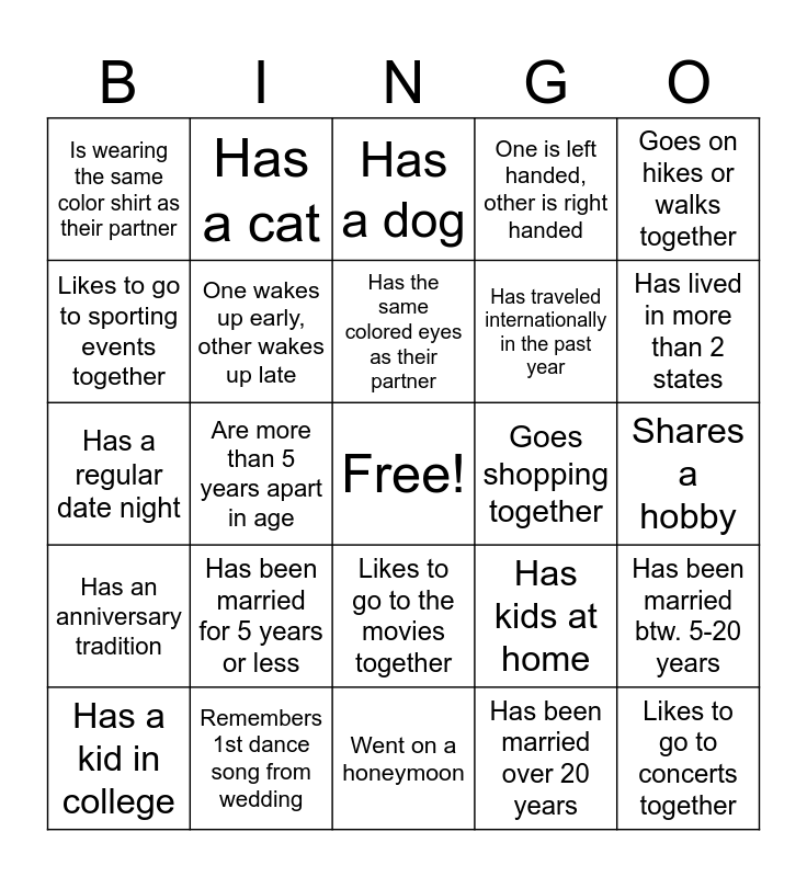 This bingo card has a free space and 24 words: Has been married for 5 years or less, Remembers 1st dance song from wedding, Has the same colored eyes as their partner, Has a kid in college, Goes on hikes or walks together, Is wearing the same color shirt as their partner, Likes to go to sporting events together, Has a cat, Goes shopping together, Likes to go to the movies together, Has traveled internationally in the past year, Has a regular date night, Has kids at home, Has been married btw. 5-20 years, One wakes up early, other wakes up late, Has been married over 20 years, Shares a hobby, Has a dog, Has lived in more than 2 states, Are more than 5 years apart in age, Likes to go to concerts together, Has an anniversary tradition, One is left handed, other is right handed and Went on a honeymoon.