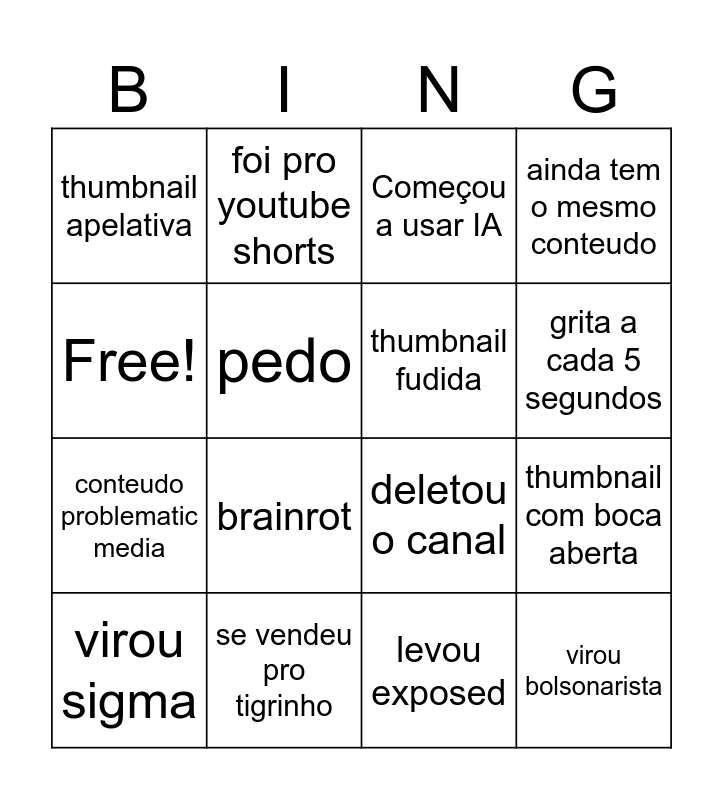 This bingo card has 16 words: se vendeu pro tigrinho, thumbnail com boca aberta, Começou a usar IA, thumbnail apelativa, conteudo problematic media, foi pro youtube shorts, deletou o canal, levou exposed, Free!, pedo, virou sigma, ainda tem o mesmo conteudo, brainrot, grita a cada 5 segundos, thumbnail fudida and virou bolsonarista.
