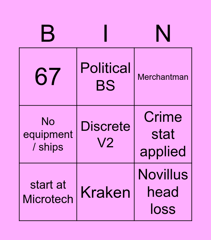 This bingo card has a free space and 8 words: Crime stat applied, Merchantman, Political BS, start at Microtech, 67, Novillus head loss, No equipment / ships and Kraken.
