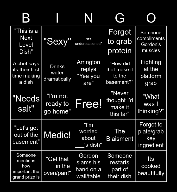 This bingo card has a free space and 47 words: Gordon says "Shame", Its cooked beautifully, Someone throws or drops their plate on the platform, Gordon slams his hand on a wall/table, Medic!, "Dancing on my palate", "Sexy", Sent to elimination as a motivater, A chef says its their first time making a dish, Uncontrolled Fire, Drinks water dramatically, Forgot to grab protein, Forgot to plate/grab key ingredient, The Blaisment, Someone makes a dish inspired by heritage, Chefs don't agree on best/worst dish, Arrington replys "Yea you are", "Never thought I'd make it this far", "This is a very tough decision", Someone compliments Gordon's muscles, "I'm not ready to go home", Someone restarts part of their dish, "This is a Next Level Dish", "How did that make it to the basement?", "I make this all the time", Fighting at the platform grab, Someone mentions how important the grand prize is, Someone drops/burns food, "I'm worried about ___'s dish", "Let's get out of the basement", Something falls off the platform, "I'm grateful for this experience.", "It's Raw!", "Better ingredients", "Don't over complicate it!", "Get that ___ in the oven/pan!", "What was I thinking?", "I'm feeling good about my grab.", "Focus!", "Cook like you want it!", "It's overcooked.", "It's underseasoned", "Needs salt", Mentor panics about platform, Pivot, Mentors trash talk eachother from different floors. and Chef has tragic back story.