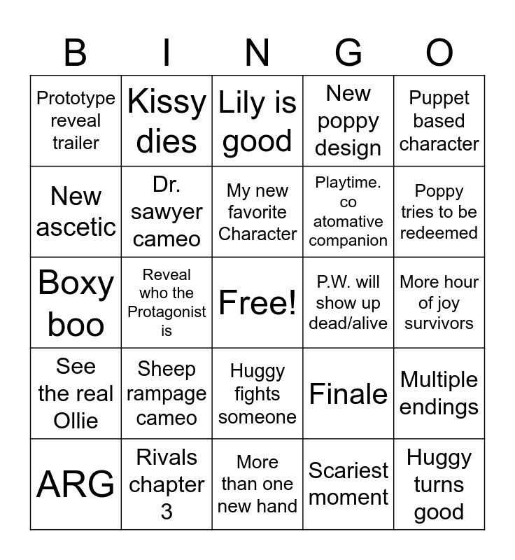 This bingo card has a free space and 24 words: ARG, Sheep rampage cameo, My new favorite Character, Scariest moment, Puppet based character, Prototype reveal trailer, Kissy dies, Lily is good, P.W. will show up dead/alive, More hour of joy survivors, Boxy boo, Dr. sawyer cameo, Finale, Multiple endings, New ascetic, Rivals chapter 3, More than one new hand, New poppy design, Poppy tries to be redeemed, See the real Ollie, Reveal who the Protagonist is, Huggy fights someone, Playtime. co atomative companion and Huggy turns good.