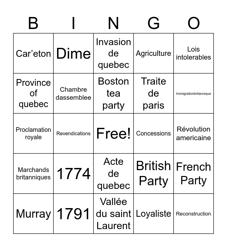 This bingo card has a free space and 24 words: 1774, 1791, Boston tea party, Murray, Lois intolerables, Car’eton, Province of quebec, Dime, Concessions, Acte de quebec, Traite de paris, Proclamation royale, British Party, French Party, Chambre dassemblee, Loyaliste, Révolution americaine, Invasion de quebec, Immigrationbritannique, Revendications, Reconstruction, Marchands britanniques, Agriculture and Vallée du saint Laurent.