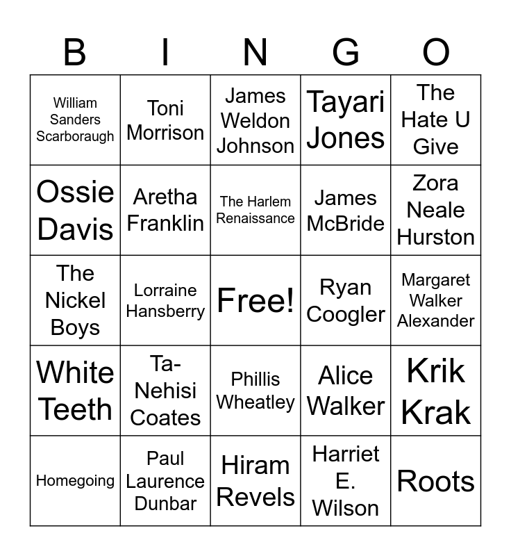 This bingo card has a free space and 30 words: Paul Laurence Dunbar, C. Liegh McInnis, Lorraine Hansberry, Harriet Jacobs, William Sanders Scarboraugh, James Weldon Johnson, Aretha Franklin, Phillis Wheatley, Ryan Coogler, Hiram Revels, Margaret Walker Alexander, Roots, Harriet E. Wilson, Jesmyn Ward, Zora Neale Hurston, Charles Johnson, Alice Walker, White Teeth, Ta-Nehisi Coates, The Hate U Give, The Nickel Boys, Ernest J. Gaines, Toni Morrison, James McBride, Ossie Davis, Tayari Jones, Krik Krak, Homegoing, The Harlem Renaissance and Booker T. Washington.