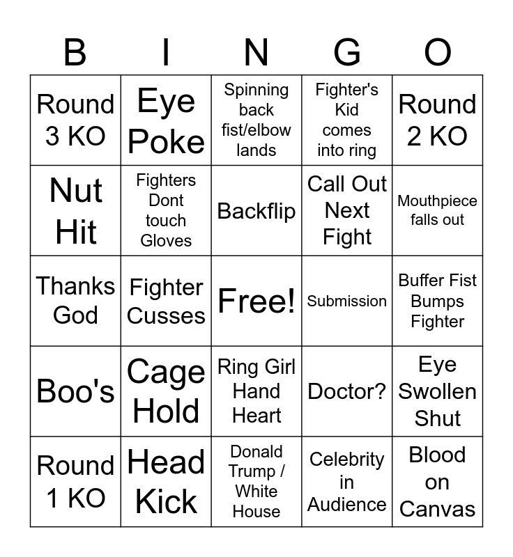 This bingo card has a free space and 24 words: Cage Hold, Head Kick, Backflip, Round 1 KO, Round 2 KO, Round 3 KO, Nut Hit, Eye Poke, Submission, Ring Girl Hand Heart, Call Out Next Fight, Thanks God, Doctor?, Eye Swollen Shut, Fighters Dont touch Gloves, Celebrity in Audience, Buffer Fist Bumps Fighter, Spinning back fist/elbow lands, Mouthpiece falls out, Fighter Cusses, Blood on Canvas, Boo's, Fighter's Kid comes into ring and Donald Trump / White House.
