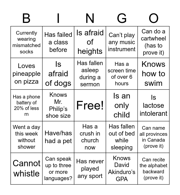 This bingo card has a free space and 24 words: Have/has had a pet, Can speak up to three or more languages?, Has fallen asleep during a sermon, Cannot whistle, Can do a cartwheel (has to prove it), Currently wearing mismatched socks, Loves pineapple on pizza, Has failed a class before, Is an only child, Has a crush in church now, Has a screen time of over 6 hours, Has a phone battery of 20% of less rn, Has fallen out of bed while sleeping, Can name all provinces in Canada (prove it), Is afraid of dogs, Knows David Akinduro’s GPA, Is lactose intolerant, Is afraid of heights, Knows how to swim, Knows Mr. Philip’s shoe size, Can recite the alphabet backward (prove it), Went a day this week without shower, Can’t play any music instrument and Has never played any sport.