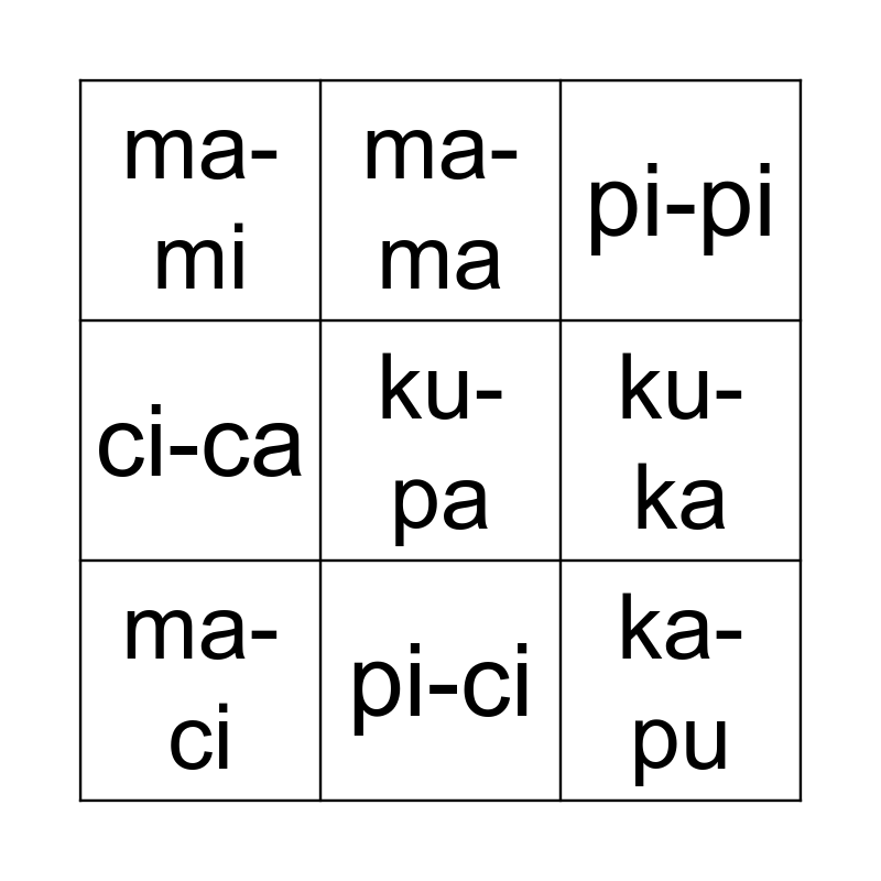 This bingo card has a free space and 11 words: pa-ci, pi-ci, ka-pu, ma-ci, ma-ma, pi-pi, ku-ka, li-la, ci-ca, ma-mi and pa-pa.
