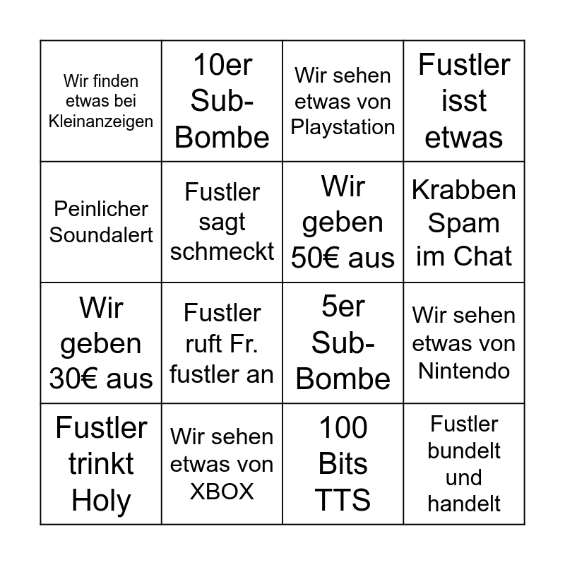 This bingo card has 16 words: Wir sehen etwas von XBOX, Wir sehen etwas von Nintendo, Wir sehen etwas von Playstation, Wir finden etwas bei Kleinanzeigen, Wir geben 30€ aus, 10er Sub-Bombe, 5er Sub-Bombe, 100 Bits TTS, Peinlicher Soundalert, Fustler sagt schmeckt, Fustler trinkt Holy, Fustler isst etwas, Fustler ruft Fr. fustler an, Krabben Spam im Chat, Wir geben 50€ aus and Fustler bundelt und handelt.